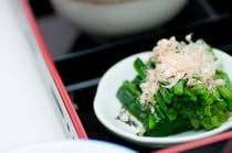 - ほうれん草を、さっと茹で、ざるにあげて冷ます。