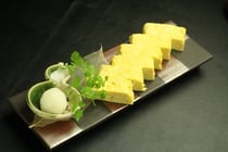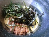 - 業務用だし楽、水、しょうゆ、塩を溶いた卵とまぜる。