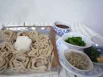 4.茹であがったそばを氷水で冷やし、お皿に盛りつける。