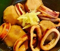 - だし汁にイカと里芋を入れ煮立たせる。