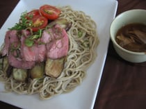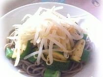 5.そばの上に、オクラ、ナス、ズッキーニ、もやしをのせる。(温かくてOK♪)