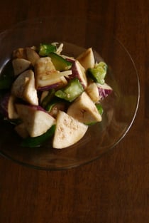 - 一口大に切ったナスは水につけてアクを抜く。