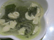 - 鍋に業務用だし楽と水を入れ、青菜と油揚げを浸し弱火にかけてだしの味を含ませる。